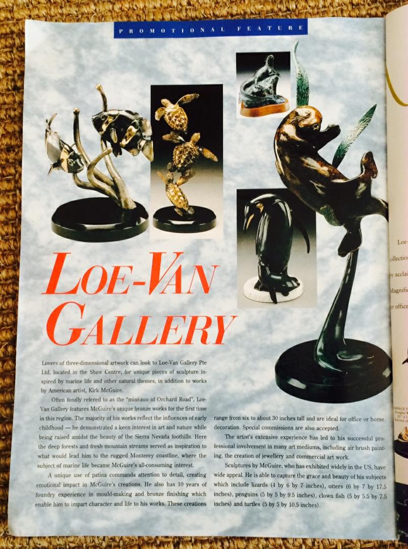 The Whitt & Krause 'Objects of Fine Art' Gallery situated in San Diego, California, the Bronze Silver & Gold Gallery in Cambria, California, Christopher Bell Gallery in Monterey, California, Highlands Inn Gift Shop in Carmel, California, Bird In Hand Gallery in Key West, FL, Jungle Drums Gallery on Sanibel Island, FL, Captiva Island, FL, the Silver Fox Gallery in Arlington, Virginia, Pavo Real Gallery in Boston, MA, R. I. Patton Goldsmith’s in St. John V. I., Thomas Charles Gallery in Las Vegas, NV, Loe-Van Gallery in Singapore, Caesars Palace in Tahoe, California, Zephyr Cove Gallery in Lake Tahoe, California, Scrimshaw Gallery in Sausalito, California, Dolphin Galleries in Hawaii, Kahn Gallery in Kauai, Cannery Row Gallery in Monterey, CA, Thomas Charles Gallery in Carmel, California, and Anna’s Art Gallery in the Turks and Caicos Islands showcased Kirk McGuire's bronze sculptures.