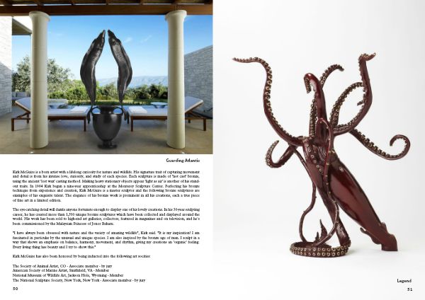 Kirk McGuire was born with a love for art and a strong curiosity about the natural environment. His talent for capturing both movement and fine details comes from his deep appreciation for every species he portrays. Each sculpture he creates is made from hot cast bronze, using the ancient technique of lost wax casting. A hallmark of his work is the ability to render heavy, solid forms in a way that makes them seem 'light as air.' In 1984, he began a nine-year apprenticeship at the Monterey Sculpture Centre, where he refined his bronze casting abilities through hands-on practice and creative exploration. McGuire is an exceptionally skilled sculptor, and the elegance of his bronze artworks is apparent in every piece, all of which are part of a limited series. Over his four-decade career in sculpture, he has crafted more than 1,500 unique bronze pieces that have been exhibited or collected worldwide. His works have found homes in esteemed art galleries and with collectors across the globe. He has also been featured in various magazines and television articles and received a commission from a princess in Malaysia's Johor Bahru. Kirk's 'Legend' table was the focal point for Triton Submarines at the 112th Annual Dinner of the Explorers Club, held at the Waldorf Astoria in New York. Triton Submarines LLC has become one of the more recent collectors of Kirk's art. For the first time, Triton successfully recorded footage of a giant squid with one of its submarines, highlighted in the Discovery Channel's program 'Curiosity.' After acquiring one of Kirk's giant squid tables, Triton has displayed his 'Legend' table at international exhibitions, including the Monaco Yacht Show. Kirk's giant squid table 'Legend' was part of the displays at the VIP Blue Ocean Film Festivals Gala and at the premiere of 'Before The Flood.' Following his worldwide travels, he spent over ten years in San Francisco, working in his studio situated in a large artist community. Kirk eventually settled in Tiburon, CA, where his home and sculpting studio provide a view of the bay that inspires his work. He continues to produce a collection of sculptures and functional bronze tables there. All of his artworks are made in limited editions or as unique commissioned pieces. While Kirk's art has mainly been sold through galleries in the past, he is now offering his creations directly to collectors through this website and also via his Etsy.com shop. He continues to fulfill international orders from his coastal sculpting studio, alongside his current product line and custom commissions. As of 2025, he is working on a commission for the University of California, Berkeley Botanical Gardens, where he is designing a 4-foot-tall bronze memorial sculpture for the gardens, which rank as the third largest campus gardens in the nation. This sculpture will feature pitcher plants, multiple tree frogs, and a dragonfly! The endangered Green Pitcher Plant (Sarracenia oreophila) is becoming increasingly rare. This memorial honors the late Dr. Jan Washburn, an environmental sciences professor, entomologist, opponent of global warming, and beloved artist.