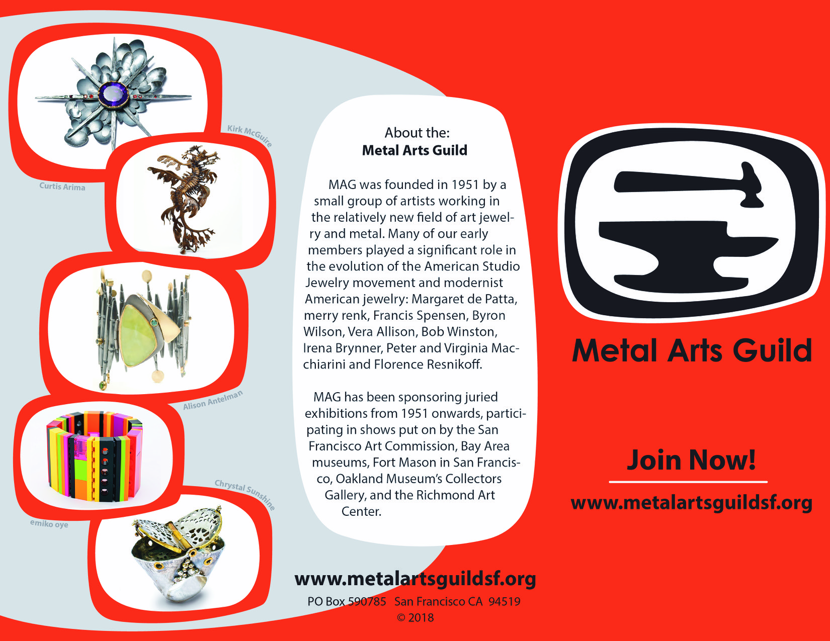 'Leafy' sculpture was requested to be featured in the Metal Arts Guild of San Francisco 2018 brochure. This is a great honor as a San Francisco Artist. The Guild, was founded in 1951 by a small group of artists working in the studio jewelry and the metal arts movement during that time. Today, their membership is comprised of professional and emerging artists, educators, students, collectors and writers.
