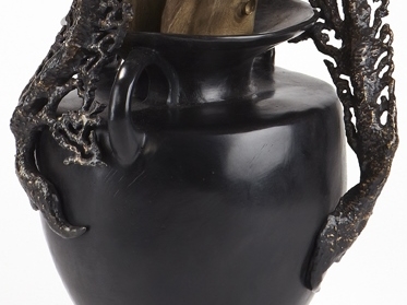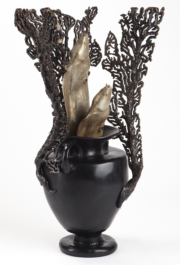 The inspiration comes from my intrigue with the Bronze Age and Minoan culture. The vase is modeled after a 15 BC Minoan amphora that has sunk to the ocean floor, providing a home for Mediterranean Moray eels. Coral emerges from the vase, offering additional shelter as the eels observe beneath the Minoan moonlight.